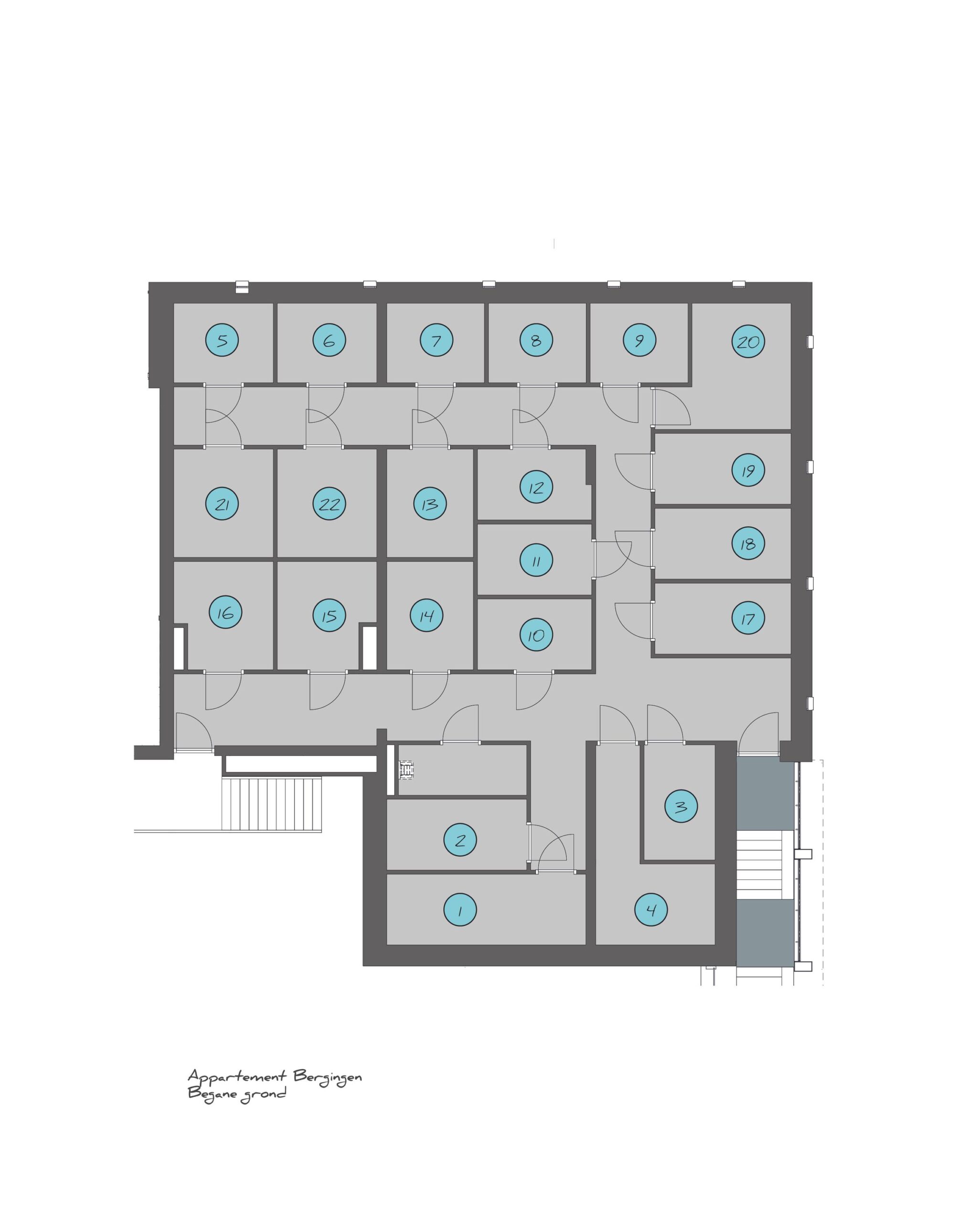 De oppervlaktes zijn gebaseerd op de basis verkooptekeningen. In het gebouw zijn 22 bergingen en 18 parkeerplaatsen gesitueerd. Op het buitenterrein zijn eveneens 18 parkeerplaatsen voorzien. Elk appartement heeft een eigen berging en ten minste één parkeerplaats. De verdeling van de parkeerplaatsen is te zien in de tabel op pagina 40. Vraag naar de verkooptekeningen voor een compleet overzicht van de parkeersituatie.