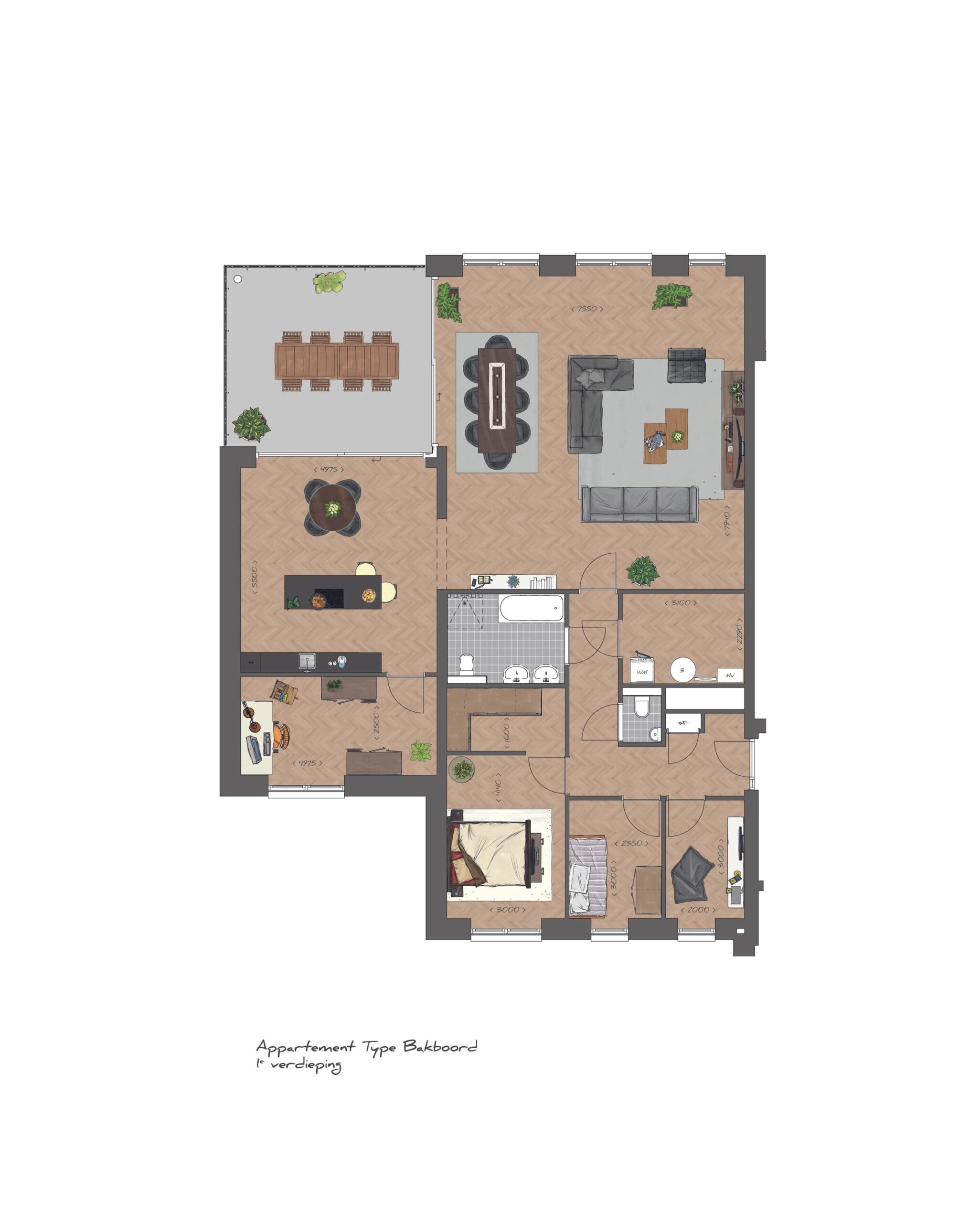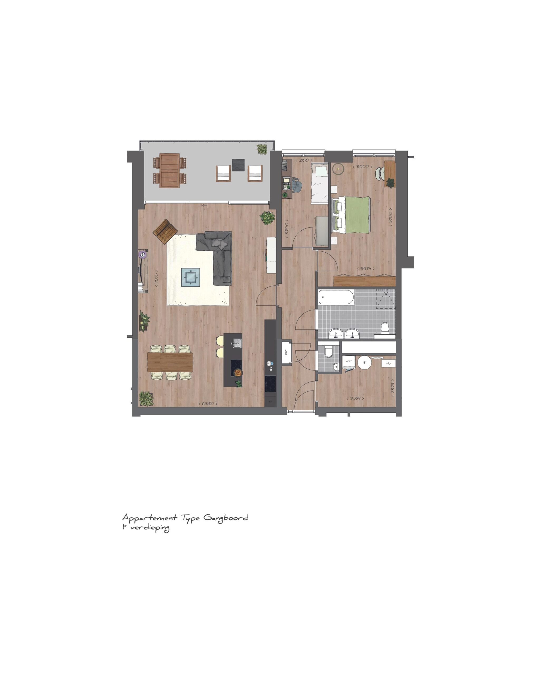 Op de eerste woonlaag bevindt zich één royaal appartement: type Brug. Type Brug komt vanwege zijn bijzondere ligging maar één keer voor in het gebouw. U kijkt hier vanaf de eerste woonlaag direct uit op het Wilhelminakanaal. Op de eerste woonlaag bevindt zich ook de centrale entree met de postvakken van alle appartementen.