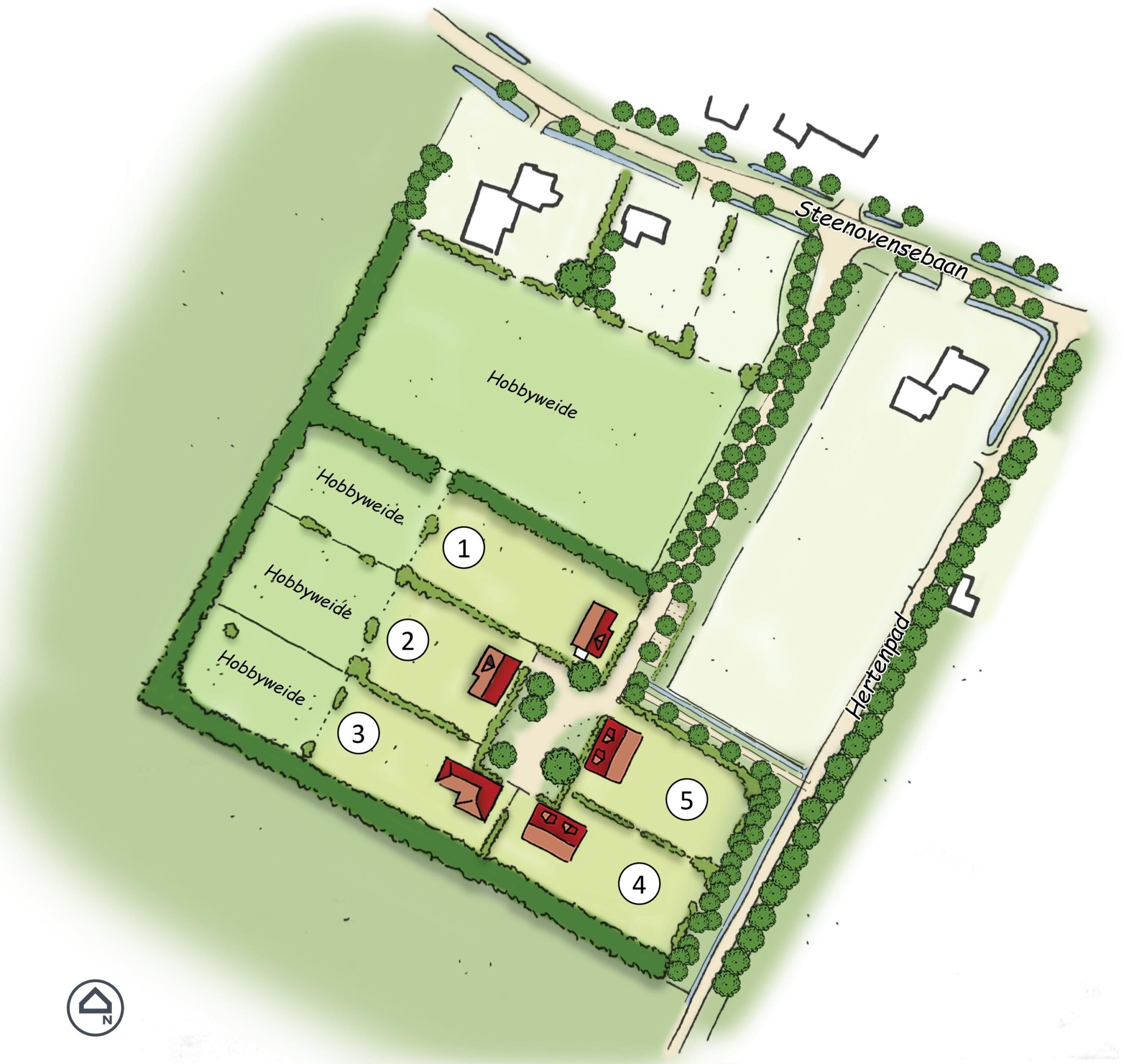 – De kaprichtingen voor kavel 3 en 4 komen evenwijdig aan de Steenovensebaan te liggen. Voor kavels 1, 2 en 5 geldt een haakse oriëntatie. Om binnen de stedenbouwkundige opzet te refereren aan een moderne interpretatie van het boerenerf, dient de breedte-lengteverhouding van het hoofdgebouw niet minder dan 1:1,5 te bedragen.