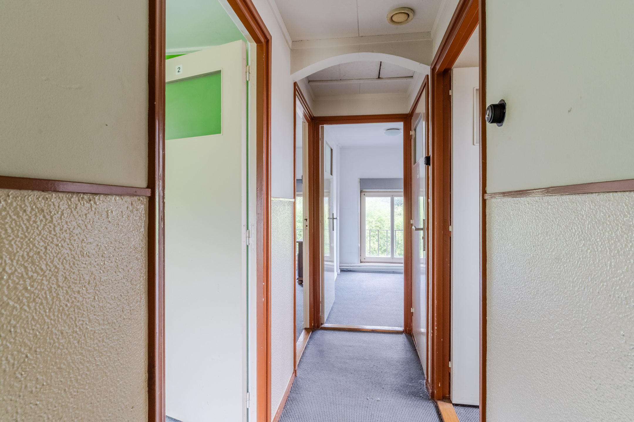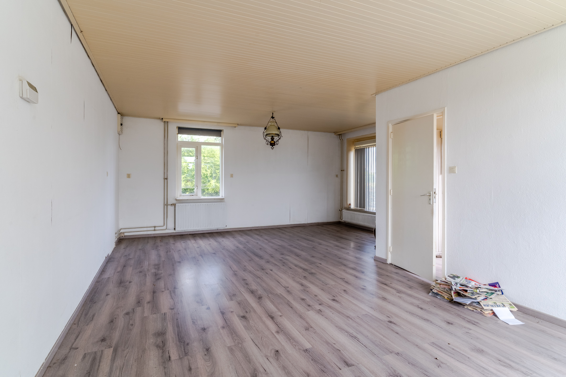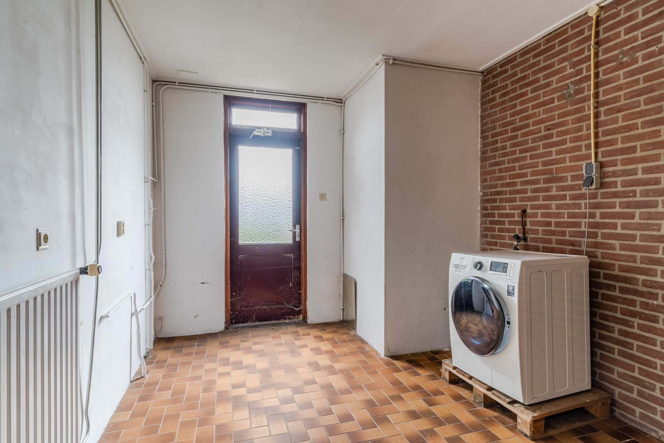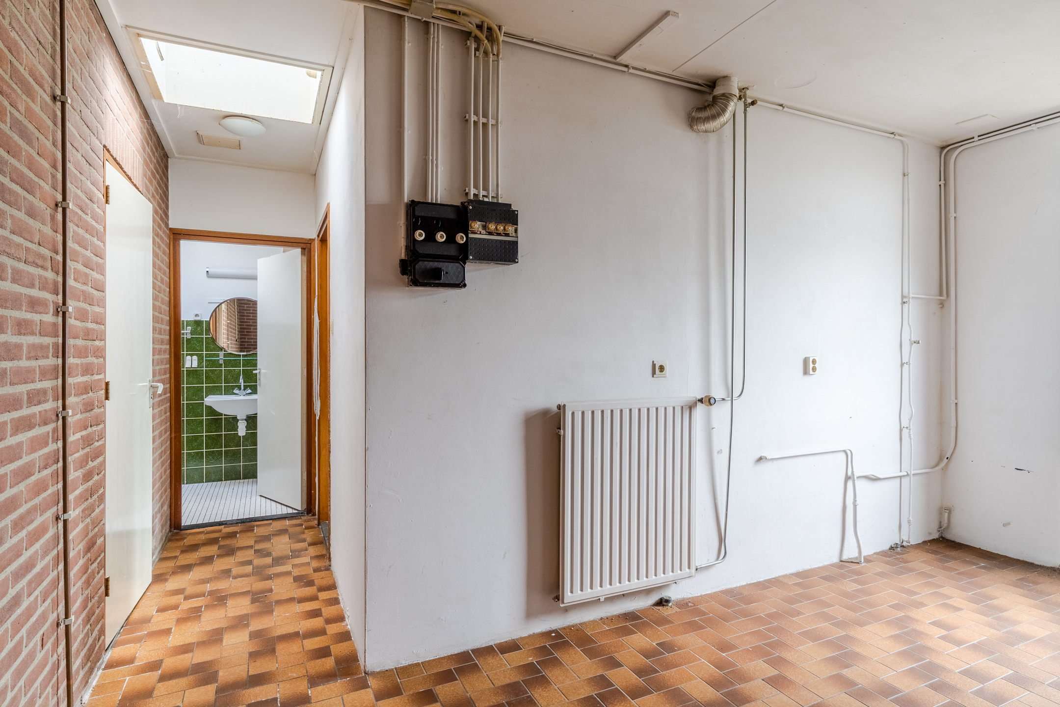 Op de begane grond bevindt zich een ruime hal met meterkast (1976) die toegang geeft tot de woonkamer en de woonkeuken. De woonkamer heeft een prettige lichtinval. De keuken, die dateert uit de jaren negentig, is praktisch ingericht en biedt voldoende ruimte. Aansluitend vind je een hal met toilet, een eenvoudige badkamer met douche en wastafel, en een ruime bijkeuken met toegang tot de buitenruimte. Op de eerste verdieping zijn vier slaapkamers aanwezig en een extra berging met wasbak.