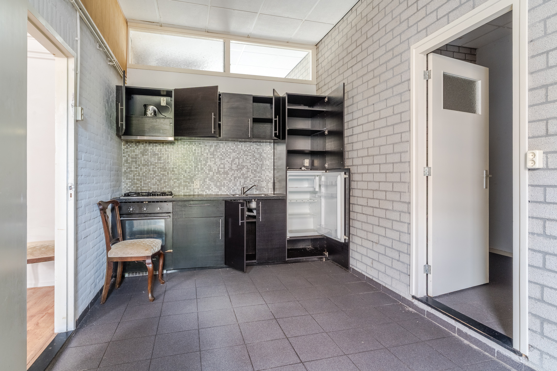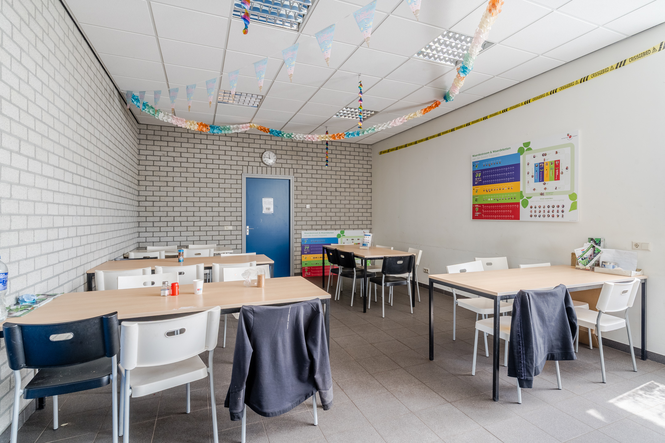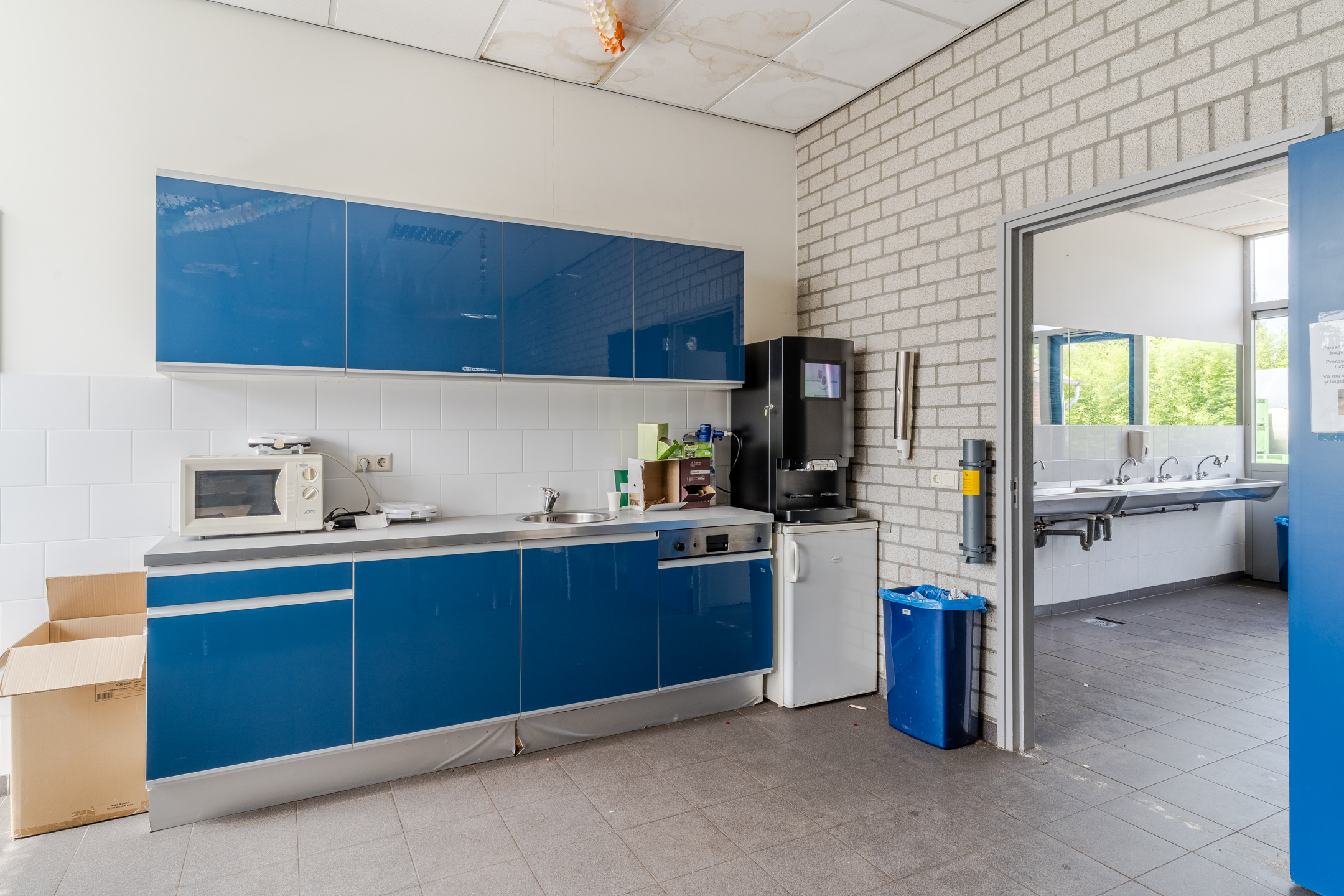 Aangrenzend aan dit appartement, met eigen entree, bevindt zich een ruime kantine, voorzien van een grote toiletruimte met meerdere toiletten en wastafels, en een multifunctionele ruimte met een keukenblok. Vanuit deze ruimte is ook de trap naar de zolder bereikbaar, evenals de berging waar zich de cv-installatie bevindt. De woning beschikt daarnaast over een aangebouwde garage, die bereikbaar is via een handmatige overheaddeur. Deze garage is ideaal voor het stallen van voertuigen, het uitvoeren van klussen of als extra bergruimte.